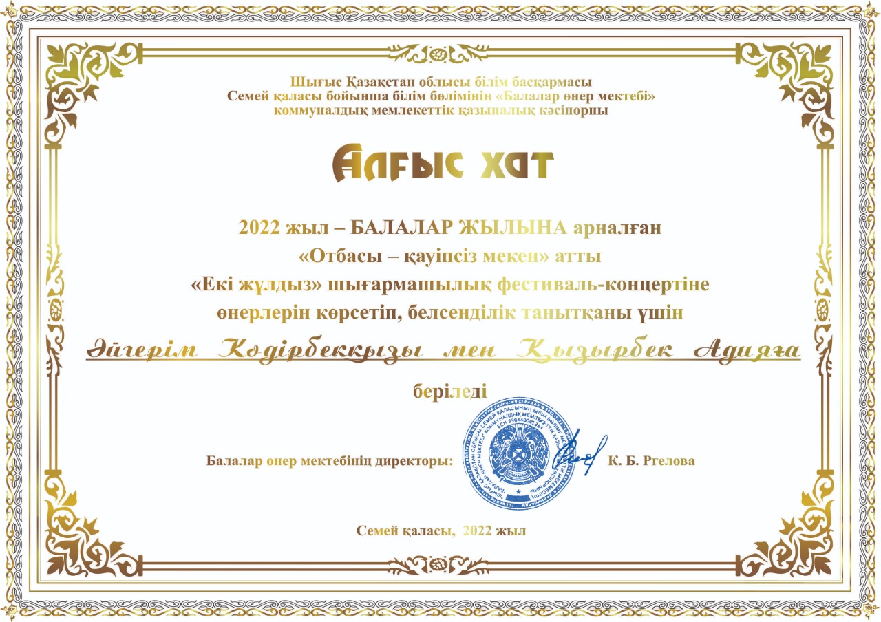 2022 жылдың 30 мамыр күні Балалар жылы аясында, вокал бөлімінің ұйымдастыруымен «Отбасы –қауіпсіз мекен” атты “Екі жұлдыз” шығармашылық фестиваль-концерті өтті.