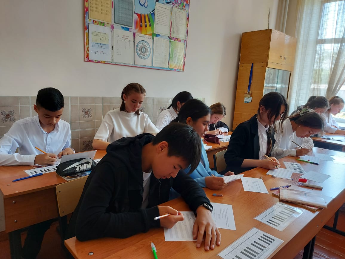 мектеп бітіру емтиханнан көрініс. «Мамандық» және «Сольфеджио» пәні бойынша 52 оқушы емтихан тапсырып шықты.